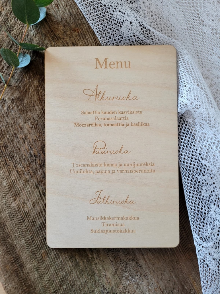 Koivusta valmistettu menukyltti tuo kattaukseen luonnollista lämpöä ja viimeisteltyä ilmettä. Kyltti toteutetaan haluamallasi tekstillä ja se sopii hienosti mm. häihin, hautajaisiin, valmistujaisiin ja muihin juhlatilaisuuksiin.